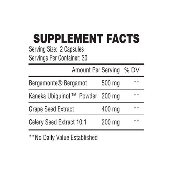 Bergamonte Bergamot, Kaneka Ubiquinol Powder, Grape Seed (Extract, Celery) Seed Extract 10;1, Magnesium Stearate, Microcrystalline Cellulose