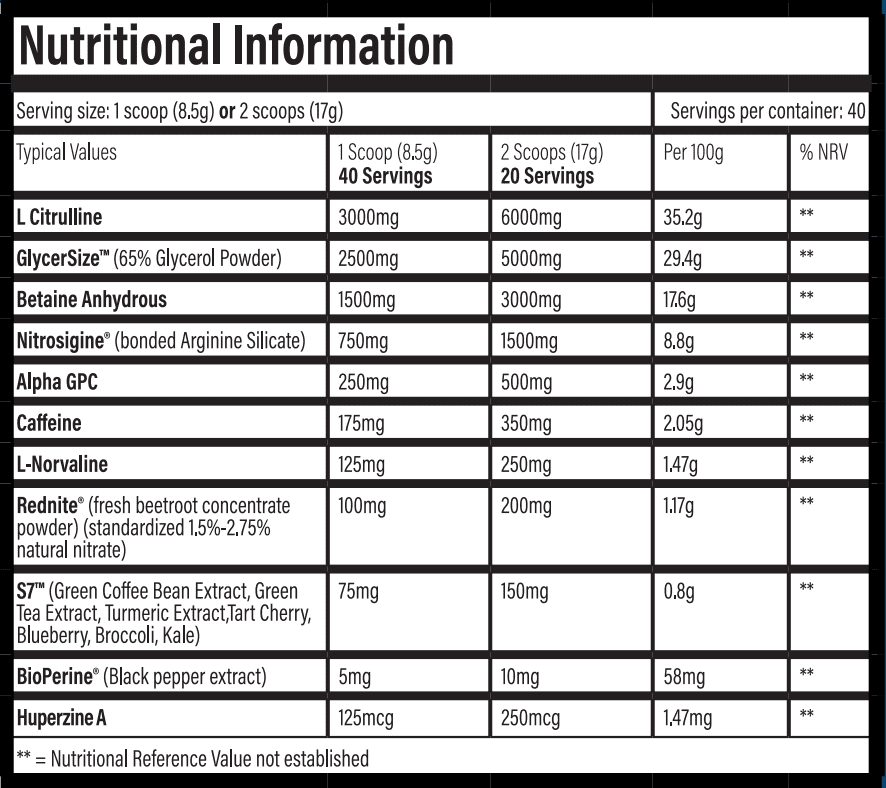 The synergy of all these ingredients is profound, and in conjunction with huperzine, caffeine and alpha GPC, results in extreme focus and a cell swelling pump!
