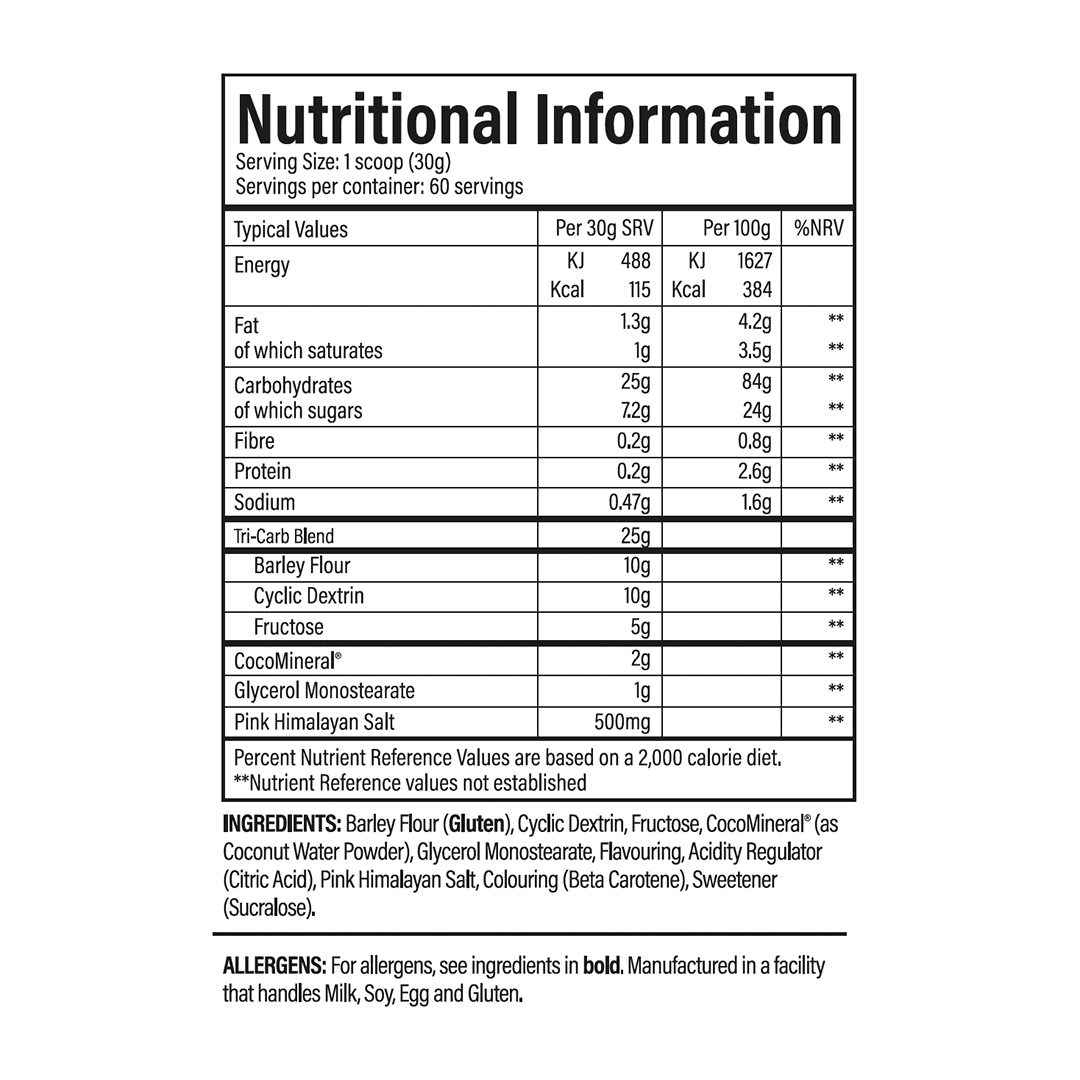 Barley Flour (Gluten), Cyclic Dextrin, Fructose, CocoMineral® (as Coconut Water Powder), Glycerol Monostearate, Flavouring, Acidity Regulator (Citric Acid), Pink Himalayan Salt, Colouring (Beta Carotene), Sweetener (Sucralose).